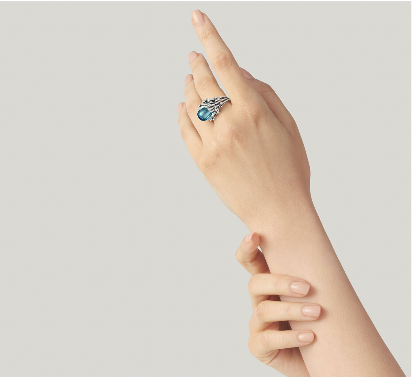 L'anello Goccia Mare si distingue per la sua raffinata e unica eleganza, frutto di un armonioso dialogo tra l’arte orafa e la natura marina. La delicata decorazione in argento, realizzata con fusione a cera persa e ispirata alla forma di un anemone marino, avvolge con grazia un cristallo color azzurro. Realizzato a mano in azienda.