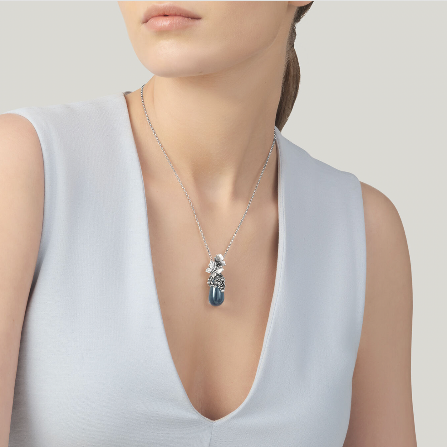 Il pendente Goccia Farfalle nasce dall’incontro tra il cristallo a goccia in una delicata sfumatura blu ciano e il decoro in argento realizzato con fusione a cera persa, che riproduce con grazia il volo di eleganti farfalle. Completa la creazione una catena rolò diamantata in argento 925, lunga 45 cm, che ne esalta la luminosità e la raffinatezza. Realizzato a mano in azienda.